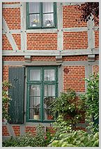 Fachwerkdetails mit Vorgartenbepflanzung am "Baumhaus" von 1774 an der