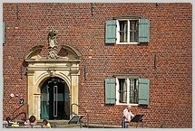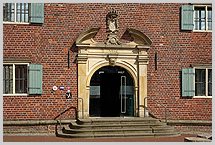 mit Granitquader-Sockelmauerwerk und Backstein-Obergeschossen; barockes Sandstein-Portal