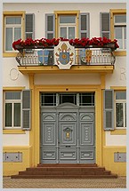und vergoldetem Bischofshut. Am Balkongeländer über dem