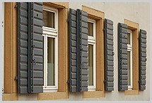 Fensterläden (Klappläden) aus Holz in süddeutscher Tradition, heute Behördensitz.