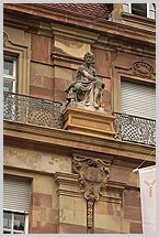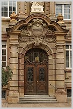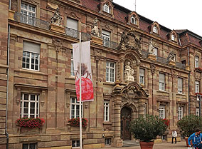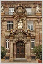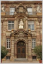dreigeschossige Prunkfassade aus Sandsteinquader-Mauerwerk (lothringischer Buntsandstein) mit
