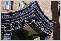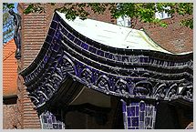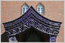 mit blauviolett glasierter Keramik (Majolika) verkleidet; figürliche keramische Bauplastik am Turm und am gesamten
