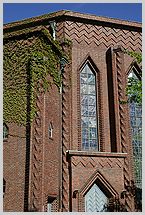 Vierungsturm; Vierung und Apsis in zweifarbigem Ziegelsichtmauerwerk,
