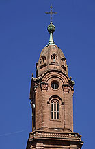 der Kirchturm in neobarocken Formen mit gemauerter Sandsteinhaube, kupferner Turmkugel und