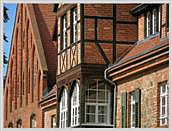 Ziegelsichtmauerwerk, Zwerchgiebel, Biberschwanz-Kronendeckung; unten