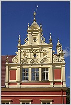 Putzfassaden, schlichte Schweifgiebel, dunkel engobierte