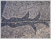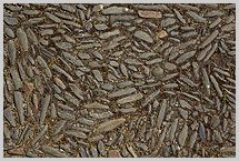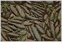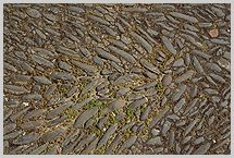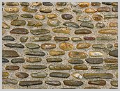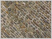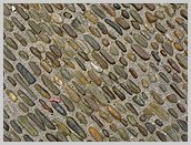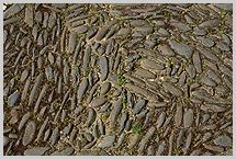 hochkant verlegte flache / längliche Lesesteine / Flusskiesel, zumindest teilweise wohl auch