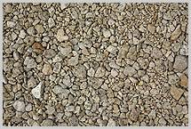 Kalksteinen, Korngrößen / Steingrößen maximal etwa 15 mm, auf einem feinkörnigen gewalzten Unterbau aus Sand / Brechsand / Feinsplitt;