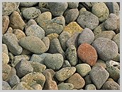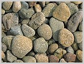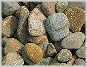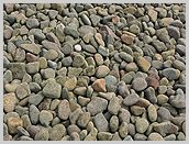 gebrochene und gerumpelte / getrommelte Steine mit Korngrößen um etwa 20-100 mm,
