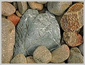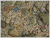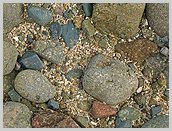 mit trockenen Rollsteinen / Rollkies im Randbereich, Gesteinsart fast