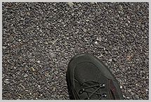 Korngrößen etwa 10-50 mm, dazu ein "Maßstabsfoto" mit Schuhgröße 46; nicht