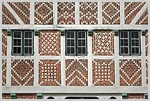 (bezogen auf das Gesamtgebäude) Ziersetzung, flächenbündig mit den Fachwerkhölzern; Fachwerkgebäude in