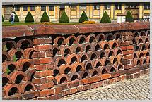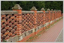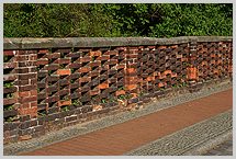 den Pfeilern ("Zaunfelder") aus versetzt gemauerten Bogenziegeln