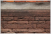 Ziegel-Deckschicht (Flachschicht, Läuferschicht) unter Fachwerkschwelle; historisches Gebäude in